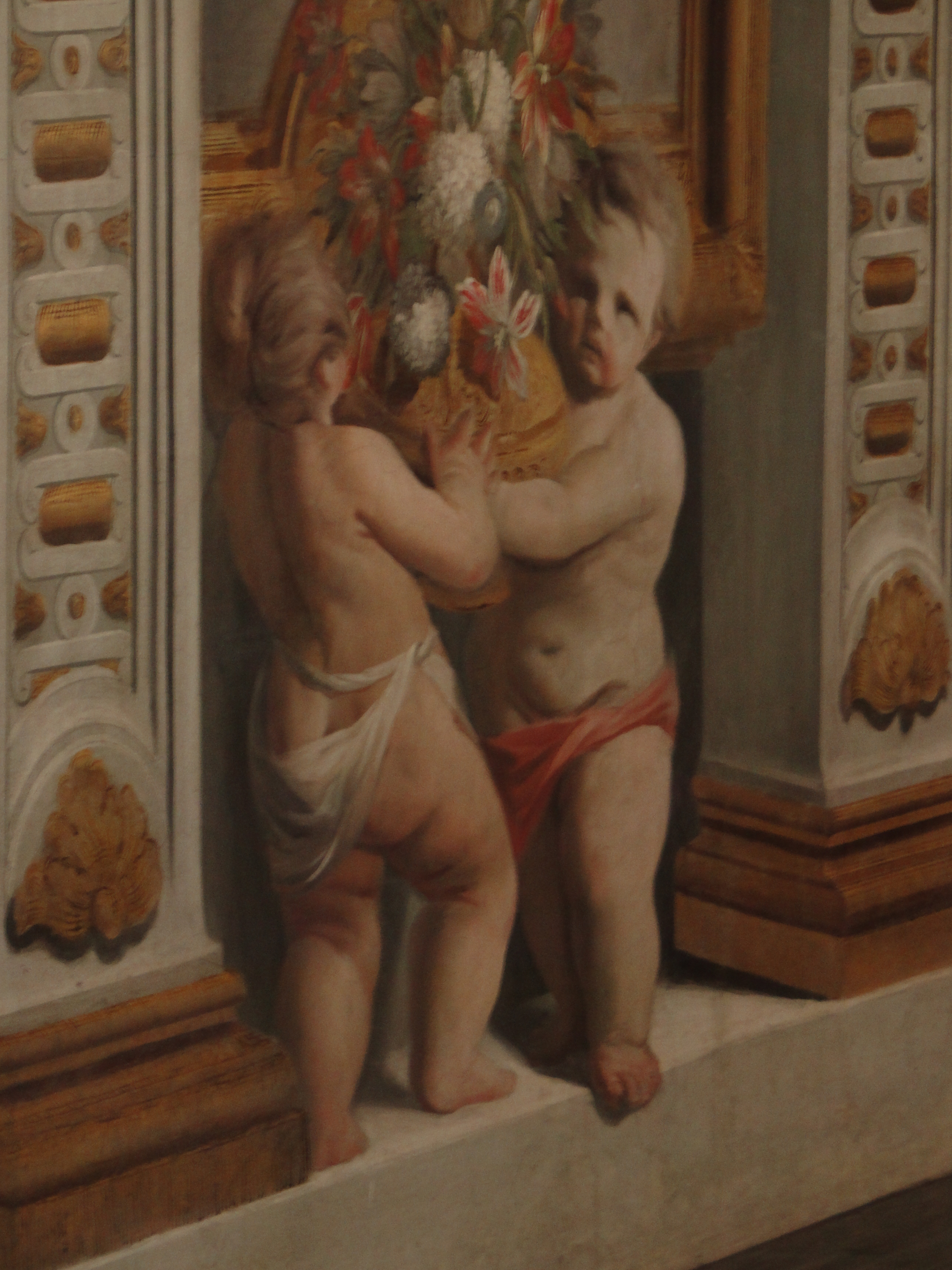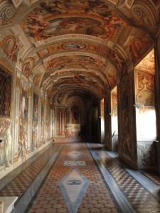 Works of art can have the power to make us see a new reality. One of the greatest painters of the Baroque age, Andrea del Pozzo, became a master at creating the illusion of a different reality, through his famous trompe-l’oeil frescoes. He is best known for painting the fake cupola inside the church of St Ignazio in central Rome (see previous posts), but the more modest corridor he painted in St Ignazio’s rooms, next to the nearby church del Gesù, leaves a more powerful impression. On an ordinary vault, he created an architectural construction of pillars, straight angles and relief curves, using his amazing technique of anamorphic painting.
