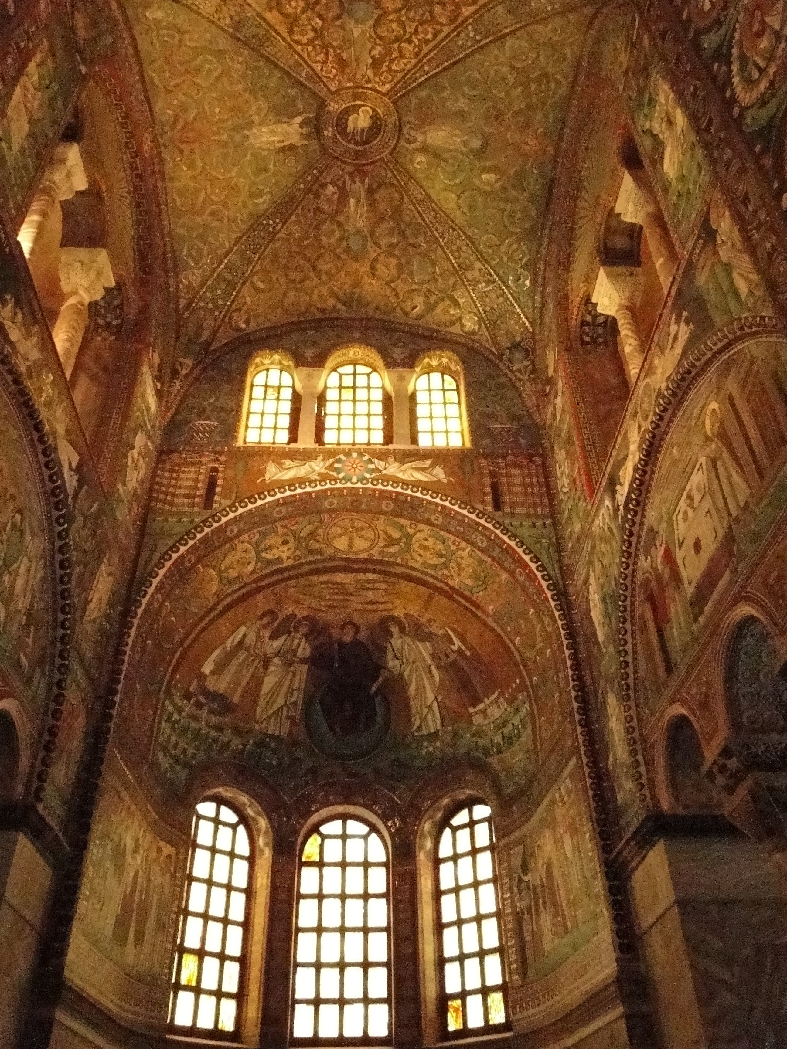 During the 5th and early 6th century, the city flourished both as political and cultural centre as can be seen from the amazing artistic legacy left to us, in particular the refined mosaics. They alone justify a trip to the city. Among the most important ones are those of the Basilica of San Vitale and adjacent mausoleum of Galla Placidia, Theodosius’s daughter and Honorius’s sister. Galla Placidia was taken from Ravenna to Gaul by Alaric during the 476 sack of Rome, and later married his successor Ataulf. At her husband’s death she rejoined her brother in Ravenna, and started playing an important role in promoting the new religion and the arts. She was also involved in politics at the head of the Western Empire but played a rather controversial part. Her mausoleum, built in the mid-5th century in the shape of a latin cross, is one of Ravenna’s oldest building.
